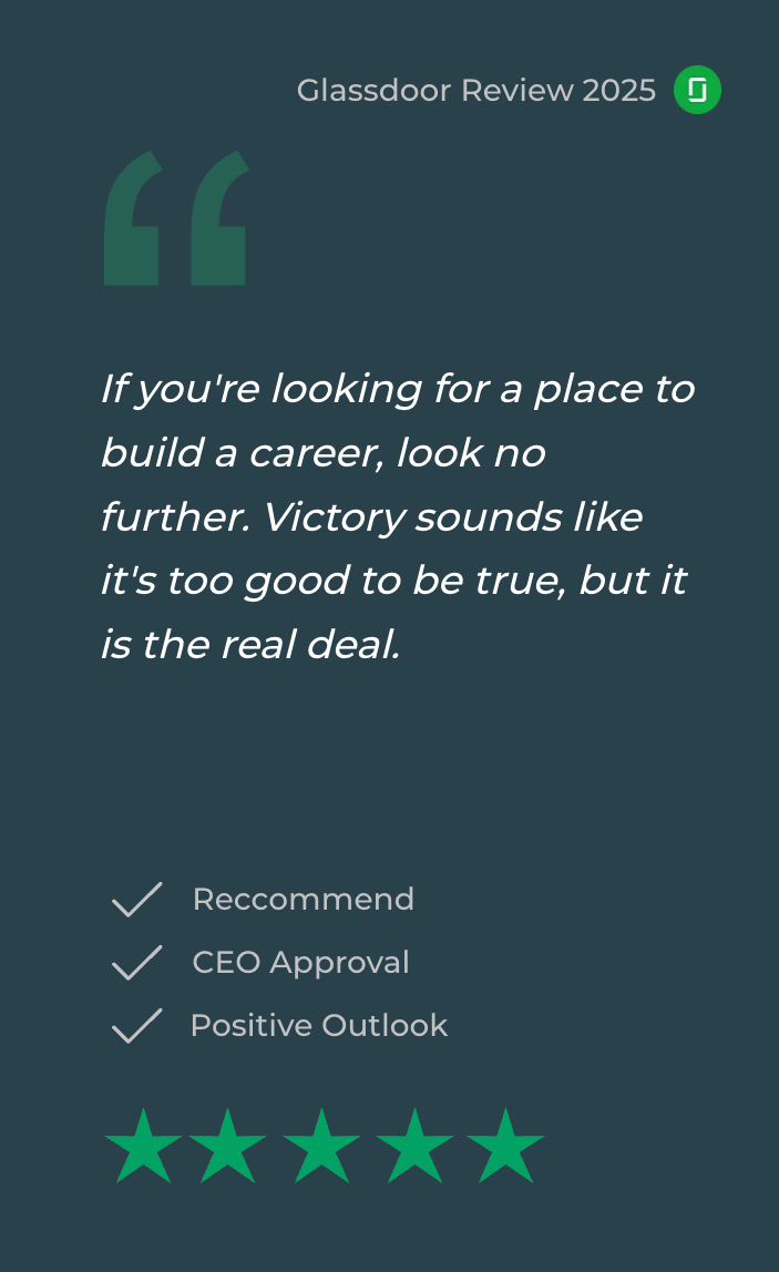 Victory is growing fast, and now’s the time to jump on board. Whether it’s your first step into a new role or your next big career leap, we’ve got a place for you. Let’s build your future, together.